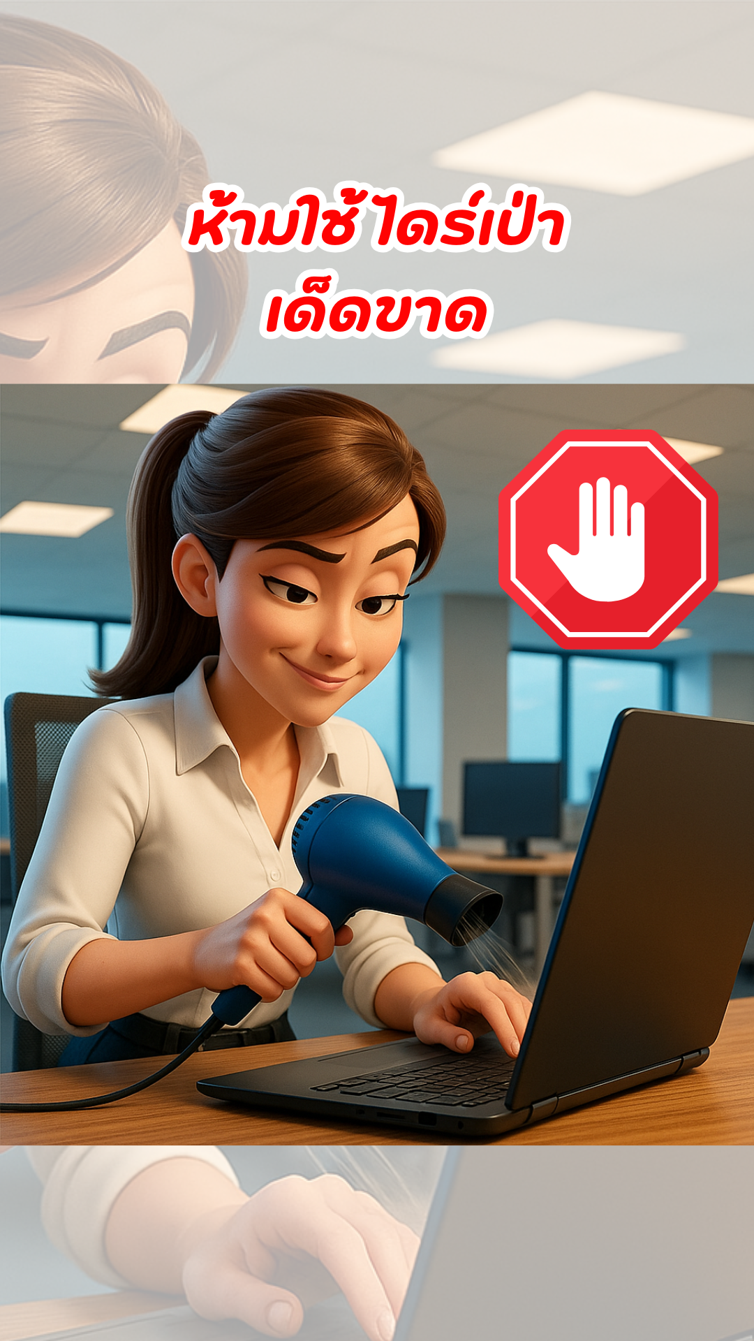 - ความแรงของลมจากไดร์เป่าผมจะ ผลักน้ำเข้าไป ลึกกว่าเดิม แทนที่จะขังอยู่แค่ใต้คียบอร์ด พอโดนลมเป่า ก็จะวิ่งเข้าเมนบอร์ด เสียหายหนักเลยทีนี้