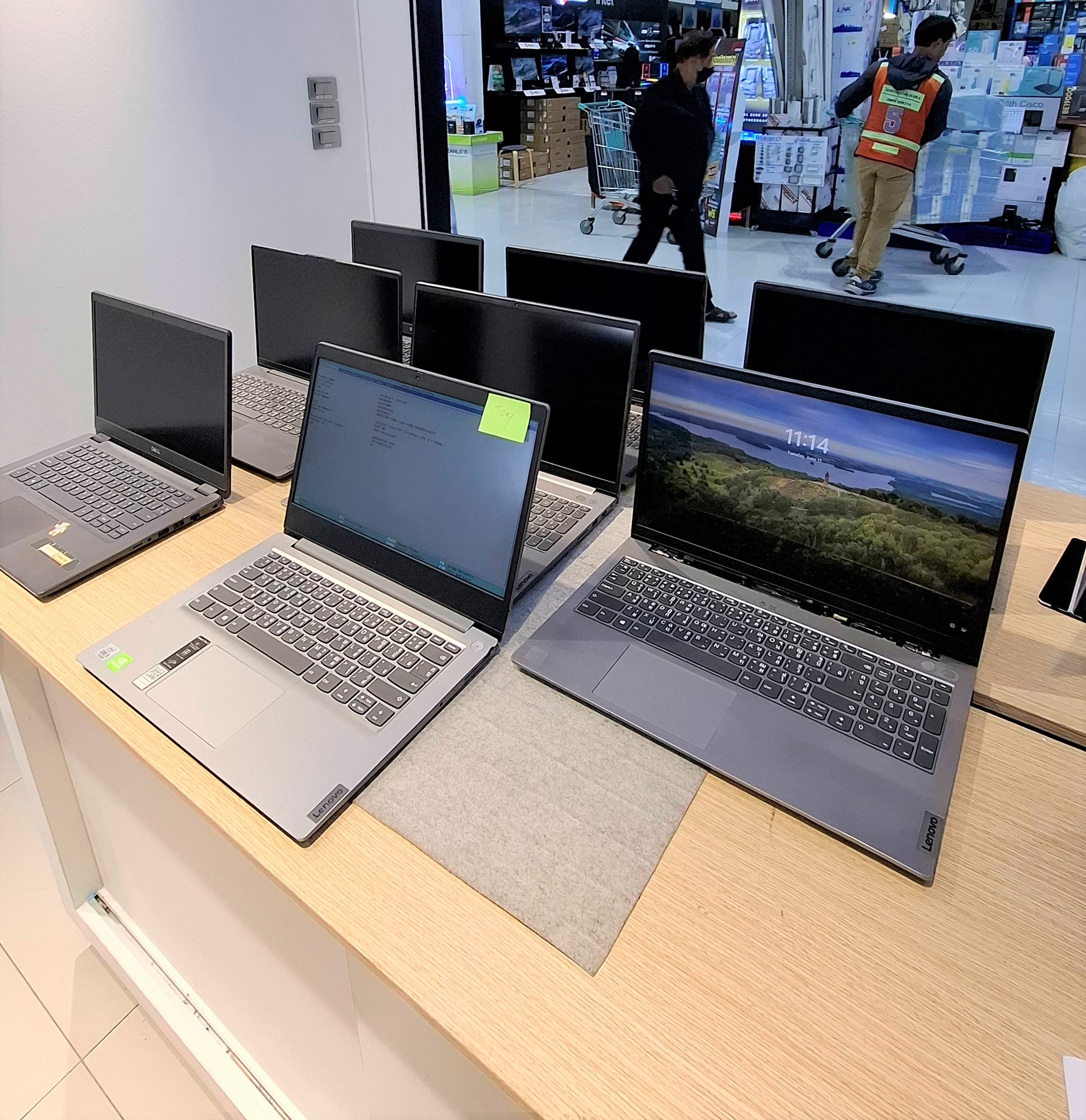ในภาพอาจดูเหมือนร้านขายคอมพิวเตอร์ เพราะมีโน๊ตบุ๊คเรียงกันเต็มโต๊ะหลายเครื่อง แต่จริง ๆ แล้ว นี่คือเครื่องลูกค้าที่ส่งมาซ่อมกับเรา "TRUE IT" ไม่ใช่เครื่องขายใหม่