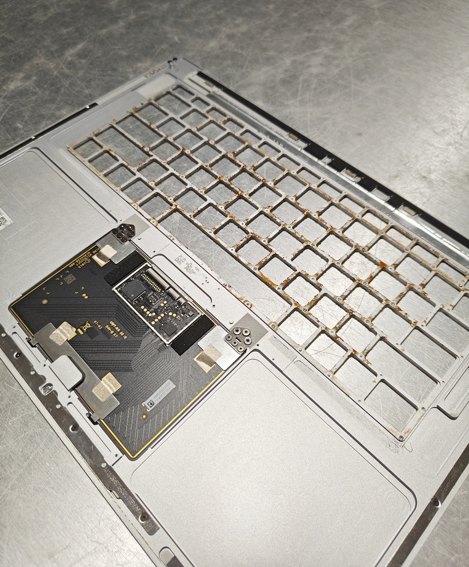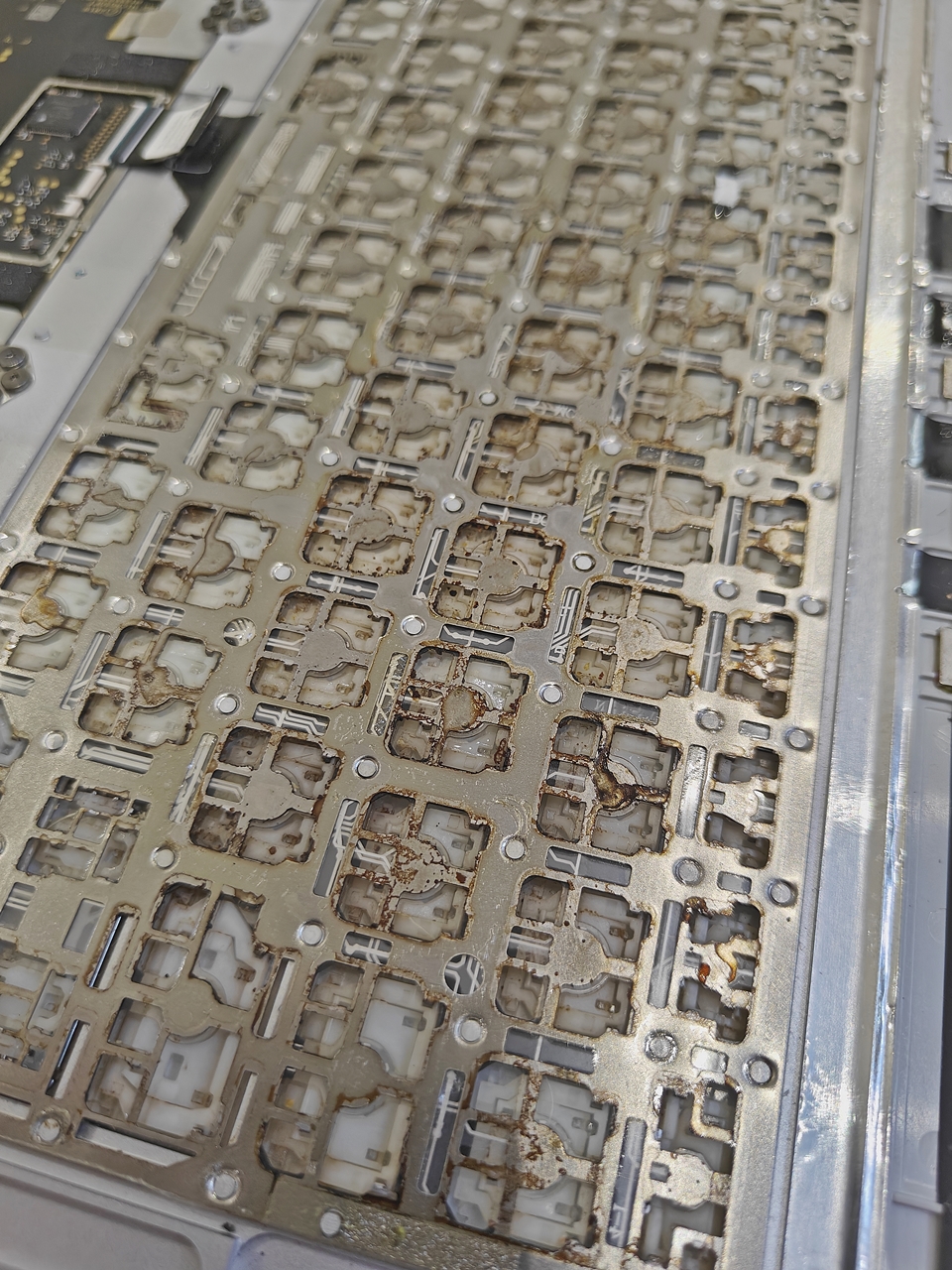 เมื่อเปิดบอดี้ออกมาดู พบว่ามี คราบน้ำตาลจากกาแฟ และ คราบเหนียวเกาะอยู่ใต้แผ่นคีย์บอร์ด เต็มไปหมด